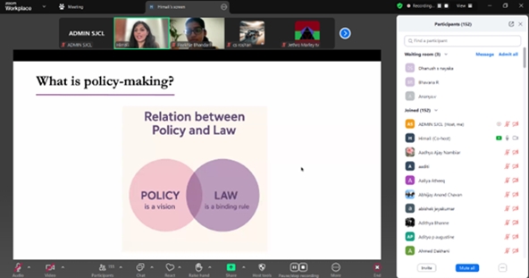 The Corporate Law Committee of St. Joseph's College of Law hosted a webinar titled "Introduction to Public Policy: From Ideas to Impact" for the 2025 batch of first-year students, focusing on tech law and policy, particularly the role of technology and AI in shaping public policy. Delivered by alumna Ms. Himali Sylvester, a TMT lawyer transitioning from Ikigai Law to SAM's tech law department, the session covered tech policy essentials—like data privacy, cybersecurity, AI governance, and the policy-law interplay via a Venn diagram—while stressing its necessity to responsibly guide innovations amid rapid tech evolution. Key highlights included a five-year career roadmap (reading tech news, writing blogs, certifications/internships, targeted firm applications, and networking for PPOs), a live policy drafting simulation on regulating deepfakes under India's Digital Safety Act balancing free speech and harm prevention, and takeaways urging early engagement, continuous learning, visibility, practical experience, and enforceable idealism.