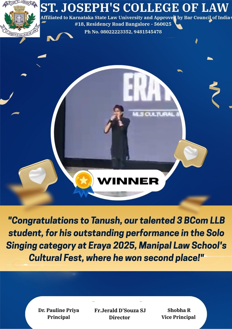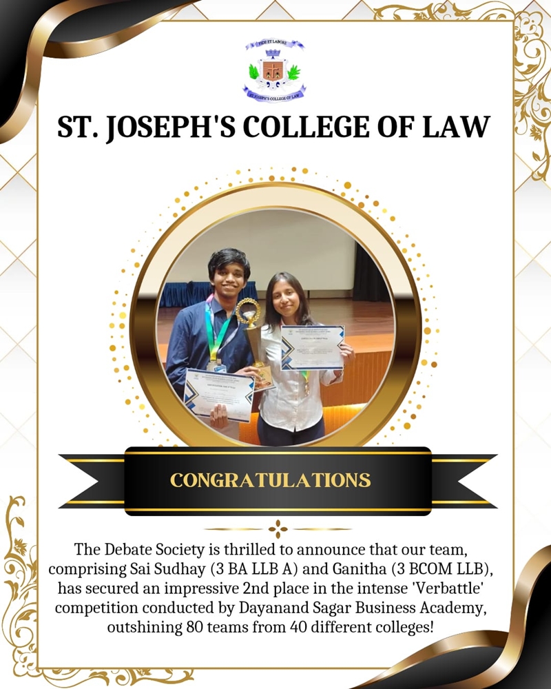 I am very proud to have graduated from St. Joseph’s College of Law where the focus is on the all-round development of the individual. The dynamic faculty members, great infrastructure along with supportive non-teaching staff helps create an environment where the students can thrive on all aspects.