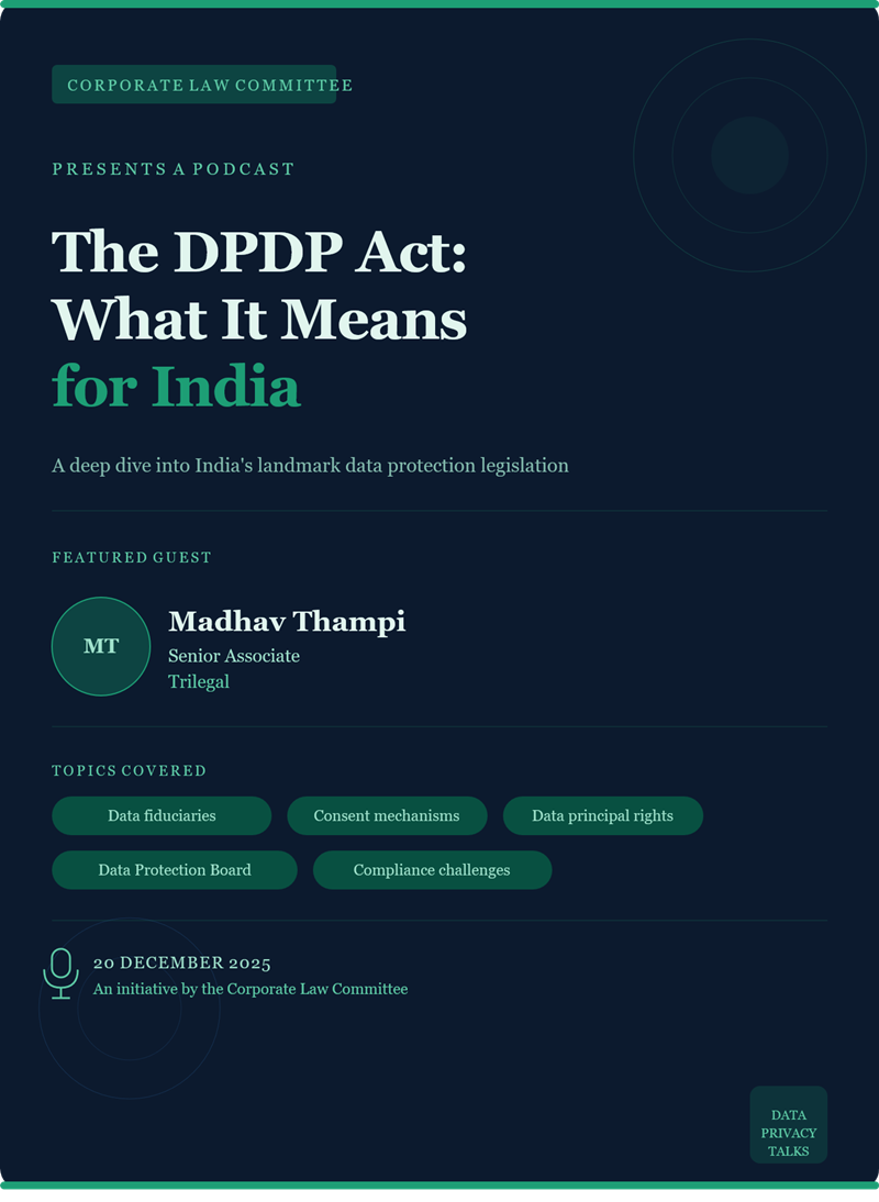 On 20 December 2025, the Corporate Law Committee organised an insightful podcast episode examining the Digital Personal Data Protection Act (DPDP Act), featuring Madhav Thampi, Senior Associate at Trilegal, one of India's leading full-service law firms. The conversation offered a practitioner's perspective on one of the most consequential pieces of legislation in India's recent regulatory history, exploring the Act's framework for data fiduciaries, consent mechanisms, data principal rights, and the role of the Data Protection Board of India. Drawing on his experience at Trilegal, Madhav brought nuanced insight into how businesses and legal practitioners are navigating compliance in the early stages of the Act's implementation, making the episode a valuable resource for law students, legal professionals, and anyone seeking to understand the evolving landscape of data privacy law in India.