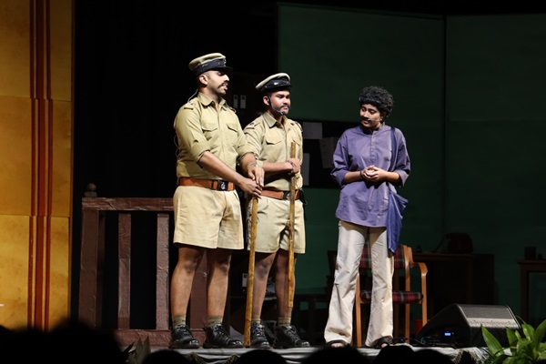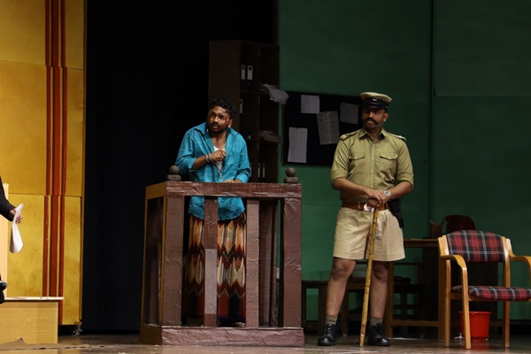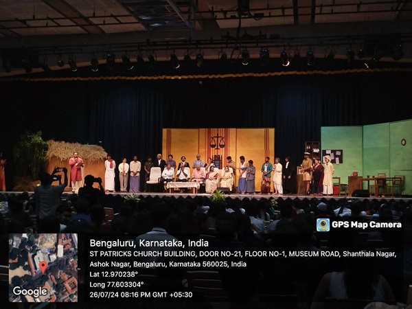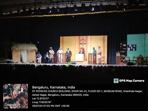 Having sold out the entire lot of passes, and with the demand for passes still persisting the Final day of the staging of play was house full (450 viewers) with immense response and appreciation from the students and others alike. On 26th July, the play commenced at 6.00 PM, which was graced by the chief guest, Mr. Mitra; film and theatre artist, the rector of BJES, Fr. Daniel Fernandes SJ, Director of SJCL; Fr. Jerald D Souza SJ, the Principal; Dr. Pauline Priya and the Vice principal Ms. Shobha Hegde. The play commenced by auspicious lighting of the lamp, and Inaugural dance by the cultural committee. The persistent effort and the commitment of the play teams bore fruit in the marvellous, flawless and coordinated display of talent during the one and a half hour staging of the play which seamlessly unravelled the message and medium that was continuously improved, over two months of consistent efforts. The play team members were formally thanked by inviting. The play drew applause and appreciation of the chief guest who remarked that the play was in “no way less than the theatre performance by the professional as staged in Ranga Shakara” and applauded the efforts of the law college in encouraging the art of theatre. Fr. Daniel speaking on the occasion congratulated all the participants and the play team for their efforts and Fr. Jerald highlighted the importance of the message of the play in bringing to fore the judicial system and its imperfection in delivering justice.