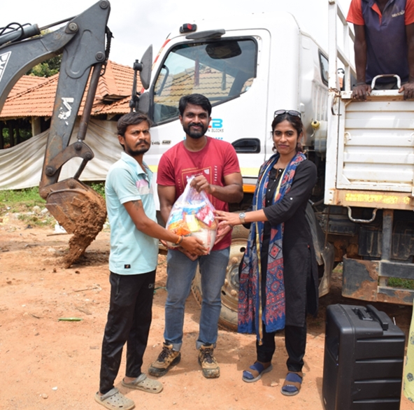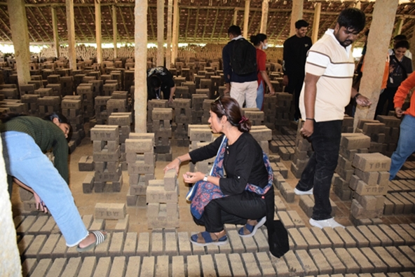 They then proceeded to a brick making community in Anekal, which proved to be an eye-opening experience. Observing the strenuous brick-making process, they also participated by moulding and arranging bricks. The workers shared their daily struggles, especially health issues from constant dust exposure and difficulties in accessing transport during the rainy season. The student’s interactions extended to the workers’ families, where they engaged with children through songs, dance and games. Grocery kits were distributed as a gesture of solidarity and support by the students to each family in the community. The day concluded with lunch followed by a reflective discussion led by the faculty, encouraging them to think critically about the social realities they had witnessed.