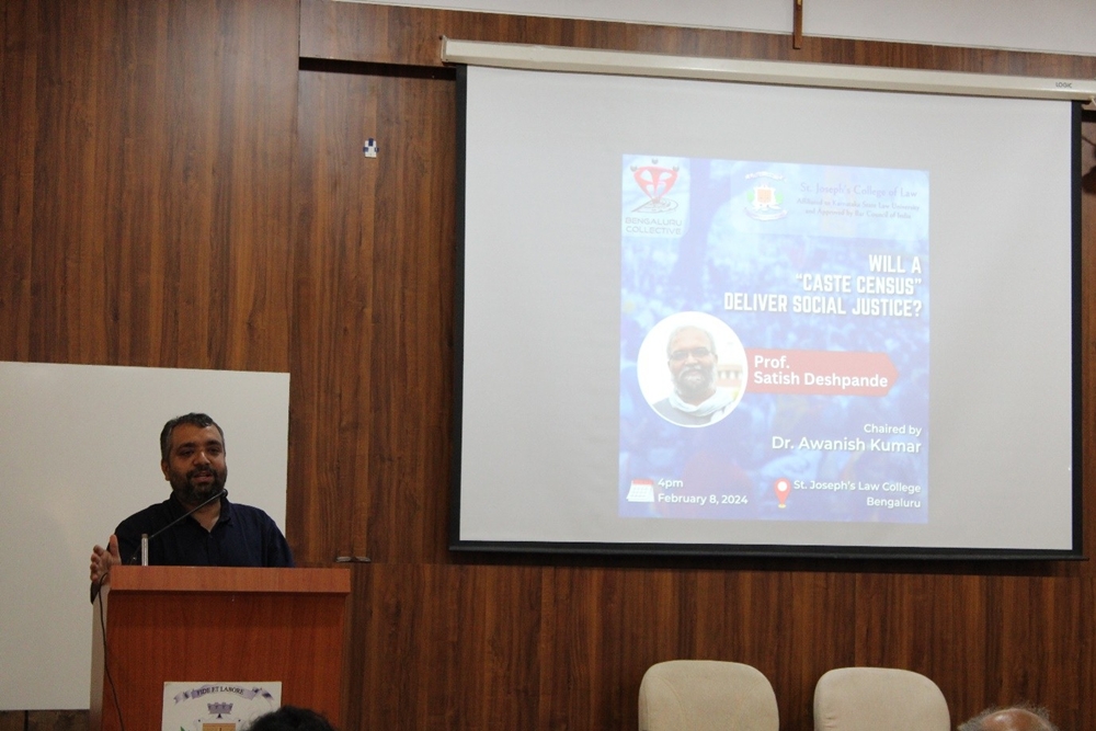 The Law & Development Committee of St. Joseph’s College of Law in collaboration with Bengaluru Collective organised a talk on Social Justice in the Context of Socio-Economic Census on 08th February 2024 at 4PM in the A V Room. The Speakers were Prof. Satish Deshpande, Prof. M N Srinivasan Chair Professor at the Institute of Social and Economic Change (ISEC), Bangalore.